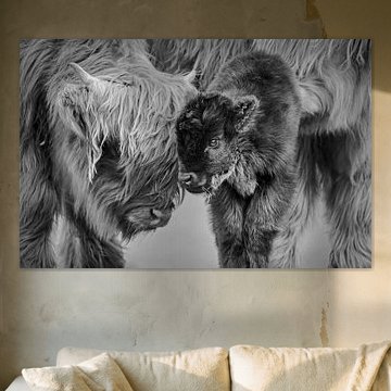 Looking for cosy cow paintings? Buy cheerful and colourful cow canvas prints here, or soothing photo prints of cows in the meadow. This beautiful rural wall art is versatile and can be combined with any interior and style. Country photography and cow paintings can be purchased from us on a customised basis and on high-quality materials. Think of impressive wallpaper with cows in the barn, or colourful cow paintings on acoustic panels to reduce the reverberation in your home.