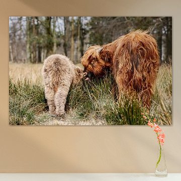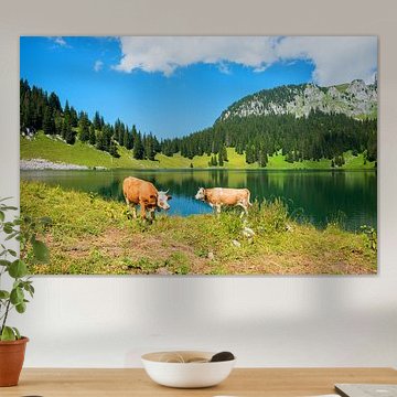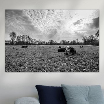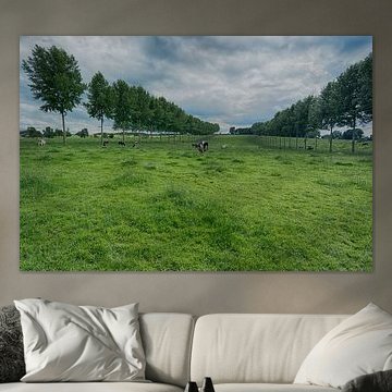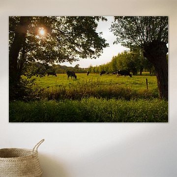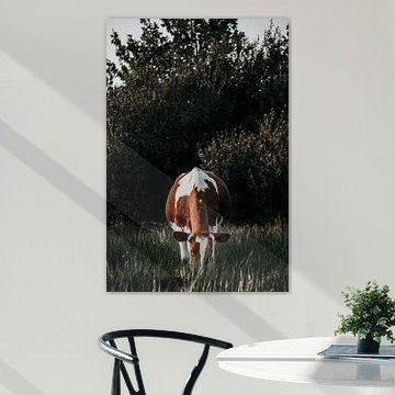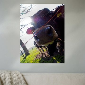 Looking for cosy cow paintings? Buy cheerful and colourful cow canvas prints here, or soothing photo prints of cows in the meadow. This beautiful rural wall art is versatile and can be combined with any interior and style. Country photography and cow paintings can be purchased from us on a customised basis and on high-quality materials. Think of impressive wallpaper with cows in the barn, or colourful cow paintings on acoustic panels to reduce the reverberation in your home.