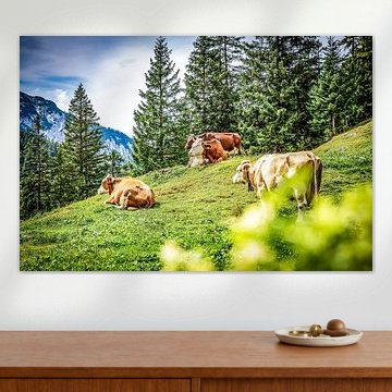 Cows fit naturally into country and rustic interiors, where their earthy palette of olive green, brown, blue, and taupe feels right at home. Pair these artworks with whitewashed wood, vintage furniture, and soft neutral walls to let the colors breathe. For a Scandinavian twist, combine the cooler blue and green tones with light oak and muted gray accents. Choose Canvas with a natural frame border to reinforce the organic, warm feel, or opt for Wallpaper to bring cows into a feature wall that anchors the room with gentle character.