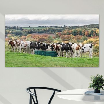 Looking for cosy cow paintings? Buy cheerful and colourful cow canvas prints here, or soothing photo prints of cows in the meadow. This beautiful rural wall art is versatile and can be combined with any interior and style. Country photography and cow paintings can be purchased from us on a customised basis and on high-quality materials. Think of impressive wallpaper with cows in the barn, or colourful cow paintings on acoustic panels to reduce the reverberation in your home.
