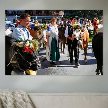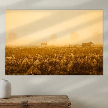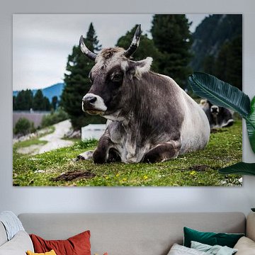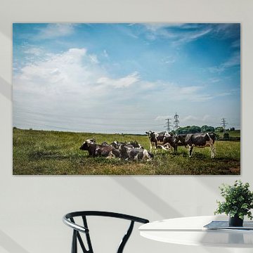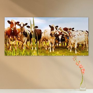 Looking for cosy cow paintings? Buy cheerful and colourful cow canvas prints here, or soothing photo prints of cows in the meadow. This beautiful rural wall art is versatile and can be combined with any interior and style. Country photography and cow paintings can be purchased from us on a customised basis and on high-quality materials. Think of impressive wallpaper with cows in the barn, or colourful cow paintings on acoustic panels to reduce the reverberation in your home.