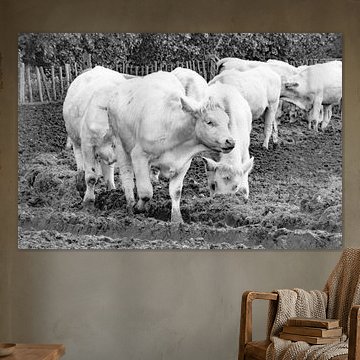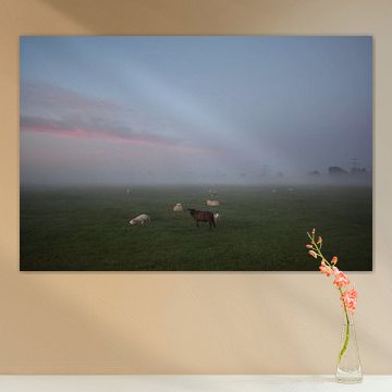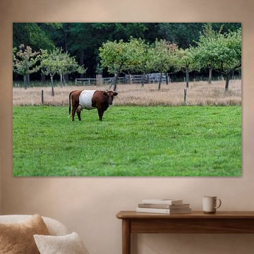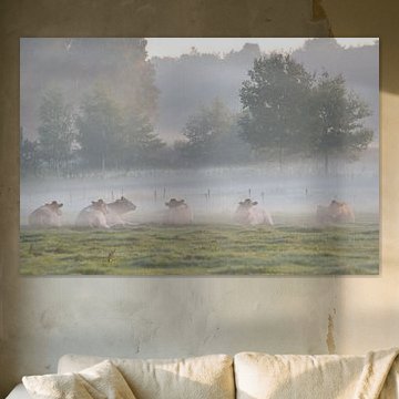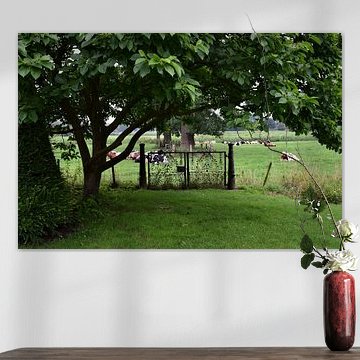 Looking for cosy cow paintings? Buy cheerful and colourful cow canvas prints here, or soothing photo prints of cows in the meadow. This beautiful rural wall art is versatile and can be combined with any interior and style. Country photography and cow paintings can be purchased from us on a customised basis and on high-quality materials. Think of impressive wallpaper with cows in the barn, or colourful cow paintings on acoustic panels to reduce the reverberation in your home.