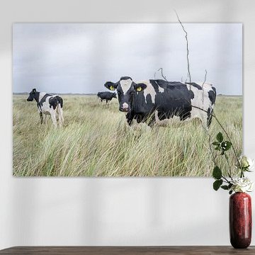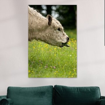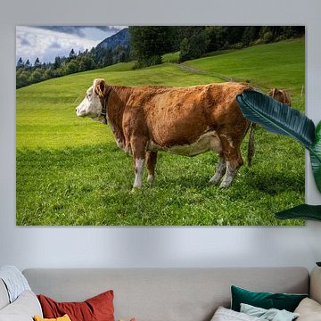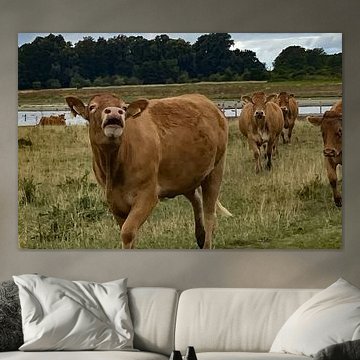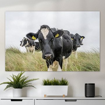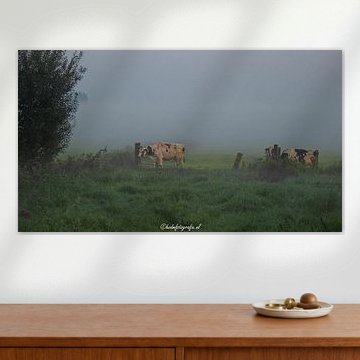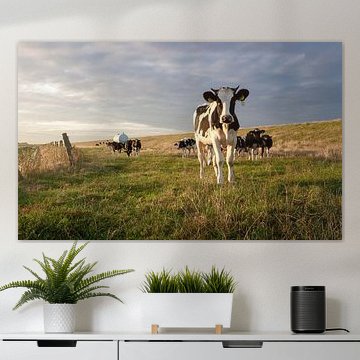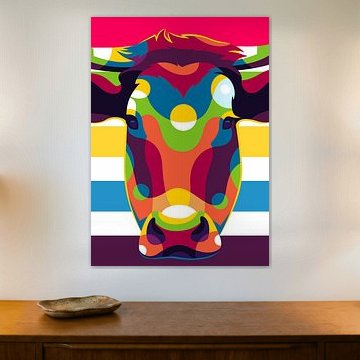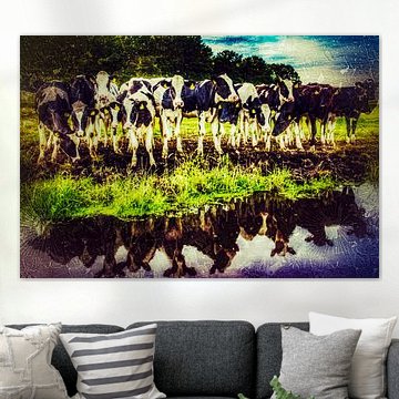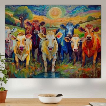 Looking for cosy cow paintings? Buy cheerful and colourful cow canvas prints here, or soothing photo prints of cows in the meadow. This beautiful rural wall art is versatile and can be combined with any interior and style. Country photography and cow paintings can be purchased from us on a customised basis and on high-quality materials. Think of impressive wallpaper with cows in the barn, or colourful cow paintings on acoustic panels to reduce the reverberation in your home.