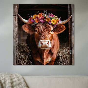 Looking for cosy cow paintings? Buy cheerful and colourful cow canvas prints here, or soothing photo prints of cows in the meadow. This beautiful rural wall art is versatile and can be combined with any interior and style. Country photography and cow paintings can be purchased from us on a customised basis and on high-quality materials. Think of impressive wallpaper with cows in the barn, or colourful cow paintings on acoustic panels to reduce the reverberation in your home.