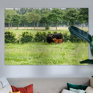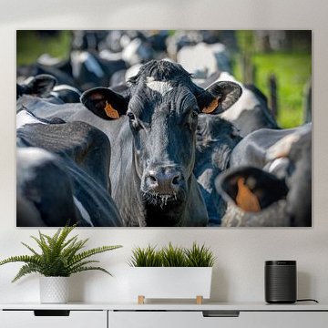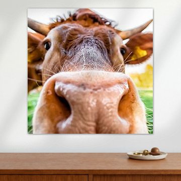 Looking for cosy cow paintings? Buy cheerful and colourful cow canvas prints here, or soothing photo prints of cows in the meadow. This beautiful rural wall art is versatile and can be combined with any interior and style. Country photography and cow paintings can be purchased from us on a customised basis and on high-quality materials. Think of impressive wallpaper with cows in the barn, or colourful cow paintings on acoustic panels to reduce the reverberation in your home.