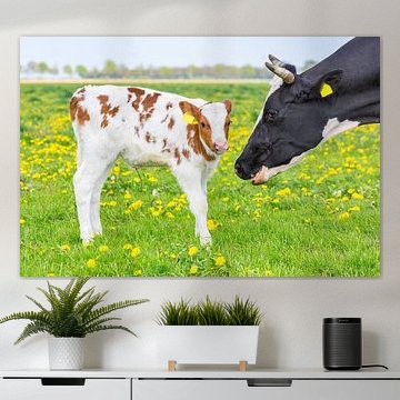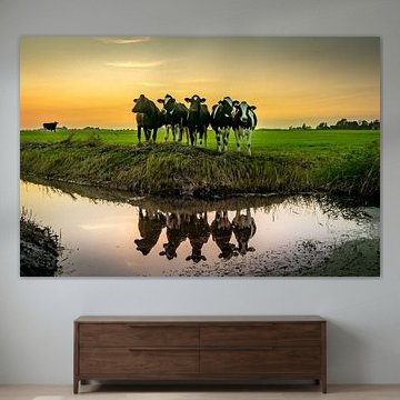 Looking for cosy cow paintings? Buy cheerful and colourful cow canvas prints here, or soothing photo prints of cows in the meadow. This beautiful rural wall art is versatile and can be combined with any interior and style. Country photography and cow paintings can be purchased from us on a customised basis and on high-quality materials. Think of impressive wallpaper with cows in the barn, or colourful cow paintings on acoustic panels to reduce the reverberation in your home.