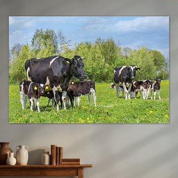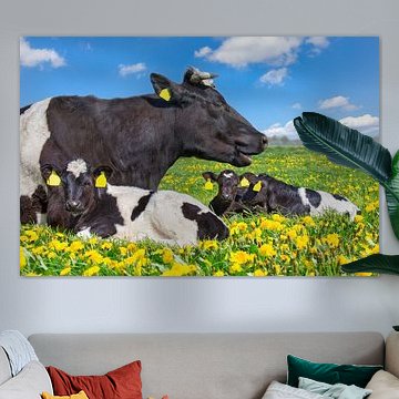 Looking for cosy cow paintings? Buy cheerful and colourful cow canvas prints here, or soothing photo prints of cows in the meadow. This beautiful rural wall art is versatile and can be combined with any interior and style. Country photography and cow paintings can be purchased from us on a customised basis and on high-quality materials. Think of impressive wallpaper with cows in the barn, or colourful cow paintings on acoustic panels to reduce the reverberation in your home.