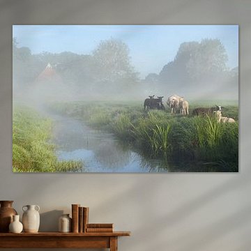 Looking for cosy cow paintings? Buy cheerful and colourful cow canvas prints here, or soothing photo prints of cows in the meadow. This beautiful rural wall art is versatile and can be combined with any interior and style. Country photography and cow paintings can be purchased from us on a customised basis and on high-quality materials. Think of impressive wallpaper with cows in the barn, or colourful cow paintings on acoustic panels to reduce the reverberation in your home.