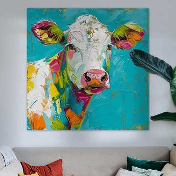 Looking for cosy cow paintings? Buy cheerful and colourful cow canvas prints here, or soothing photo prints of cows in the meadow. This beautiful rural wall art is versatile and can be combined with any interior and style. Country photography and cow paintings can be purchased from us on a customised basis and on high-quality materials. Think of impressive wallpaper with cows in the barn, or colourful cow paintings on acoustic panels to reduce the reverberation in your home.