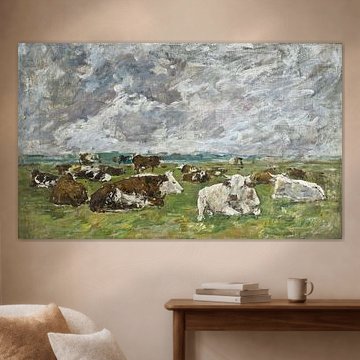 Looking for cosy cow paintings? Buy cheerful and colourful cow canvas prints here, or soothing photo prints of cows in the meadow. This beautiful rural wall art is versatile and can be combined with any interior and style. Country photography and cow paintings can be purchased from us on a customised basis and on high-quality materials. Think of impressive wallpaper with cows in the barn, or colourful cow paintings on acoustic panels to reduce the reverberation in your home.