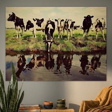 Looking for cosy cow paintings? Buy cheerful and colourful cow canvas prints here, or soothing photo prints of cows in the meadow. This beautiful rural wall art is versatile and can be combined with any interior and style. Country photography and cow paintings can be purchased from us on a customised basis and on high-quality materials. Think of impressive wallpaper with cows in the barn, or colourful cow paintings on acoustic panels to reduce the reverberation in your home.