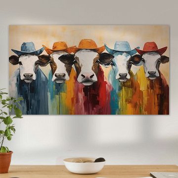 Looking for cosy cow paintings? Buy cheerful and colourful cow canvas prints here, or soothing photo prints of cows in the meadow. This beautiful rural wall art is versatile and can be combined with any interior and style. Country photography and cow paintings can be purchased from us on a customised basis and on high-quality materials. Think of impressive wallpaper with cows in the barn, or colourful cow paintings on acoustic panels to reduce the reverberation in your home.