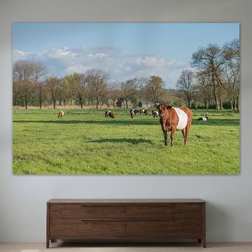 Looking for cosy cow paintings? Buy cheerful and colourful cow canvas prints here, or soothing photo prints of cows in the meadow. This beautiful rural wall art is versatile and can be combined with any interior and style. Country photography and cow paintings can be purchased from us on a customised basis and on high-quality materials. Think of impressive wallpaper with cows in the barn, or colourful cow paintings on acoustic panels to reduce the reverberation in your home.