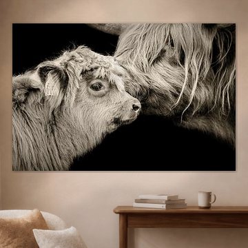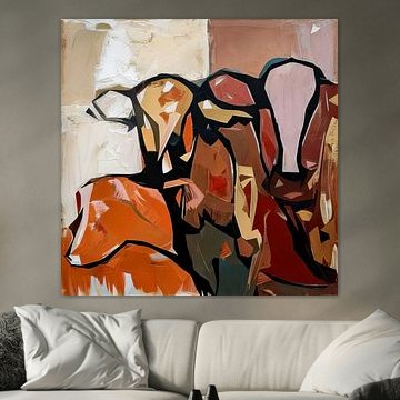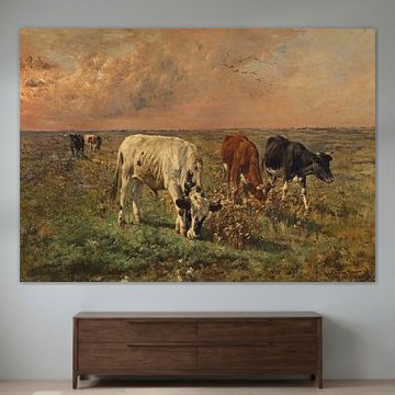 Looking for cosy cow paintings? Buy cheerful and colourful cow canvas prints here, or soothing photo prints of cows in the meadow. This beautiful rural wall art is versatile and can be combined with any interior and style. Country photography and cow paintings can be purchased from us on a customised basis and on high-quality materials. Think of impressive wallpaper with cows in the barn, or colourful cow paintings on acoustic panels to reduce the reverberation in your home.