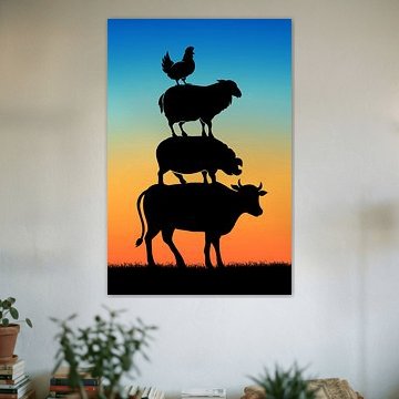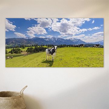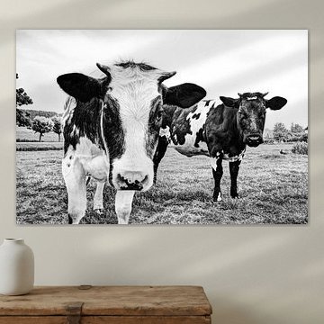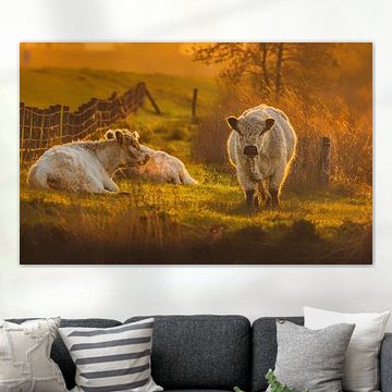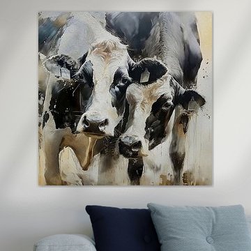 Looking for cosy cow paintings? Buy cheerful and colourful cow canvas prints here, or soothing photo prints of cows in the meadow. This beautiful rural wall art is versatile and can be combined with any interior and style. Country photography and cow paintings can be purchased from us on a customised basis and on high-quality materials. Think of impressive wallpaper with cows in the barn, or colourful cow paintings on acoustic panels to reduce the reverberation in your home.