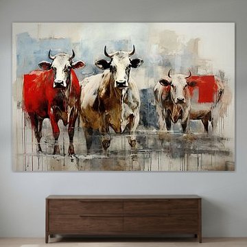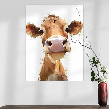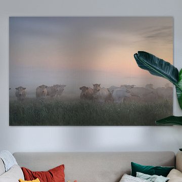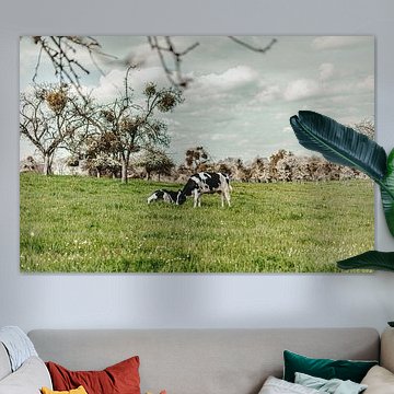 Looking for cosy cow paintings? Buy cheerful and colourful cow canvas prints here, or soothing photo prints of cows in the meadow. This beautiful rural wall art is versatile and can be combined with any interior and style. Country photography and cow paintings can be purchased from us on a customised basis and on high-quality materials. Think of impressive wallpaper with cows in the barn, or colourful cow paintings on acoustic panels to reduce the reverberation in your home.