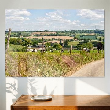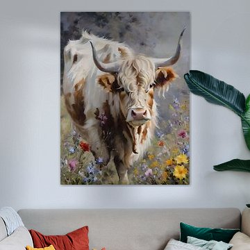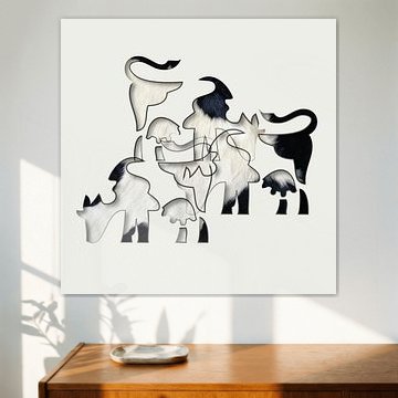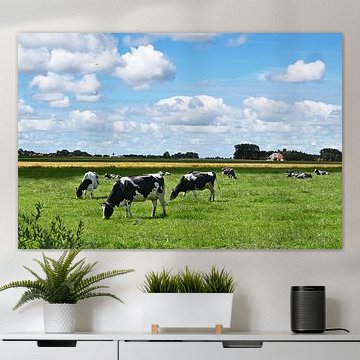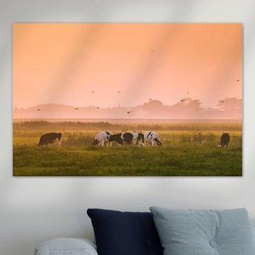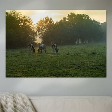 Looking for cosy cow paintings? Buy cheerful and colourful cow canvas prints here, or soothing photo prints of cows in the meadow. This beautiful rural wall art is versatile and can be combined with any interior and style. Country photography and cow paintings can be purchased from us on a customised basis and on high-quality materials. Think of impressive wallpaper with cows in the barn, or colourful cow paintings on acoustic panels to reduce the reverberation in your home.