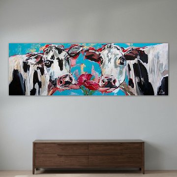 Looking for cosy cow paintings? Buy cheerful and colourful cow canvas prints here, or soothing photo prints of cows in the meadow. This beautiful rural wall art is versatile and can be combined with any interior and style. Country photography and cow paintings can be purchased from us on a customised basis and on high-quality materials. Think of impressive wallpaper with cows in the barn, or colourful cow paintings on acoustic panels to reduce the reverberation in your home.