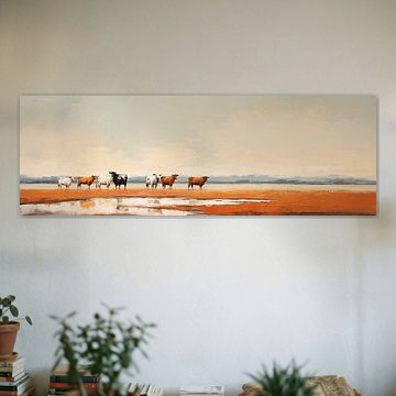Looking for cosy cow paintings? Buy cheerful and colourful cow canvas prints here, or soothing photo prints of cows in the meadow. This beautiful rural wall art is versatile and can be combined with any interior and style. Country photography and cow paintings can be purchased from us on a customised basis and on high-quality materials. Think of impressive wallpaper with cows in the barn, or colourful cow paintings on acoustic panels to reduce the reverberation in your home.