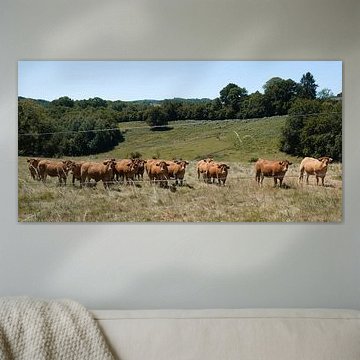 Looking for cosy cow paintings? Buy cheerful and colourful cow canvas prints here, or soothing photo prints of cows in the meadow. This beautiful rural wall art is versatile and can be combined with any interior and style. Country photography and cow paintings can be purchased from us on a customised basis and on high-quality materials. Think of impressive wallpaper with cows in the barn, or colourful cow paintings on acoustic panels to reduce the reverberation in your home.