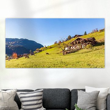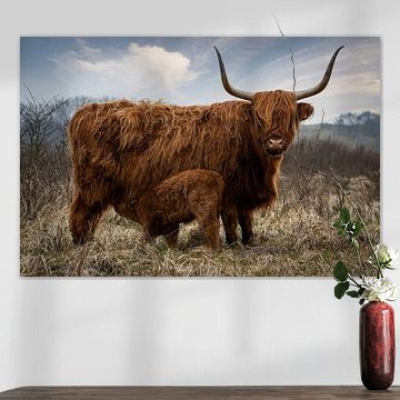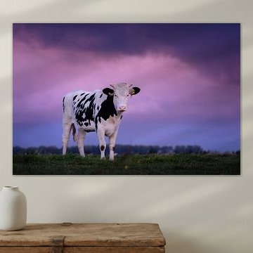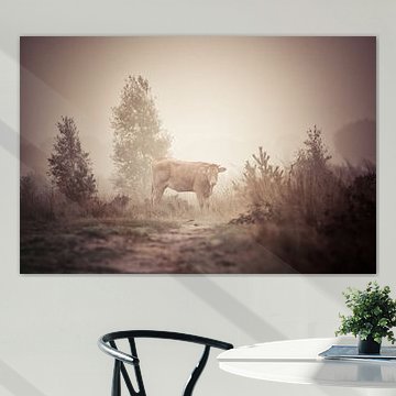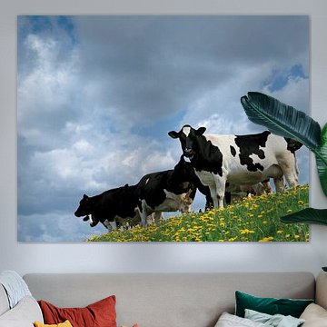 Looking for cosy cow paintings? Buy cheerful and colourful cow canvas prints here, or soothing photo prints of cows in the meadow. This beautiful rural wall art is versatile and can be combined with any interior and style. Country photography and cow paintings can be purchased from us on a customised basis and on high-quality materials. Think of impressive wallpaper with cows in the barn, or colourful cow paintings on acoustic panels to reduce the reverberation in your home.
