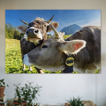 Looking for cosy cow paintings? Buy cheerful and colourful cow canvas prints here, or soothing photo prints of cows in the meadow. This beautiful rural wall art is versatile and can be combined with any interior and style. Country photography and cow paintings can be purchased from us on a customised basis and on high-quality materials. Think of impressive wallpaper with cows in the barn, or colourful cow paintings on acoustic panels to reduce the reverberation in your home.