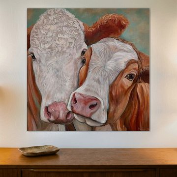 Looking for cosy cow paintings? Buy cheerful and colourful cow canvas prints here, or soothing photo prints of cows in the meadow. This beautiful rural wall art is versatile and can be combined with any interior and style. Country photography and cow paintings can be purchased from us on a customised basis and on high-quality materials. Think of impressive wallpaper with cows in the barn, or colourful cow paintings on acoustic panels to reduce the reverberation in your home.
