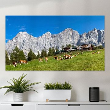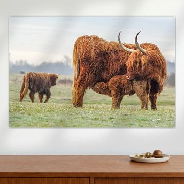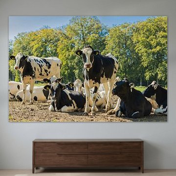 Looking for cosy cow paintings? Buy cheerful and colourful cow canvas prints here, or soothing photo prints of cows in the meadow. This beautiful rural wall art is versatile and can be combined with any interior and style. Country photography and cow paintings can be purchased from us on a customised basis and on high-quality materials. Think of impressive wallpaper with cows in the barn, or colourful cow paintings on acoustic panels to reduce the reverberation in your home.