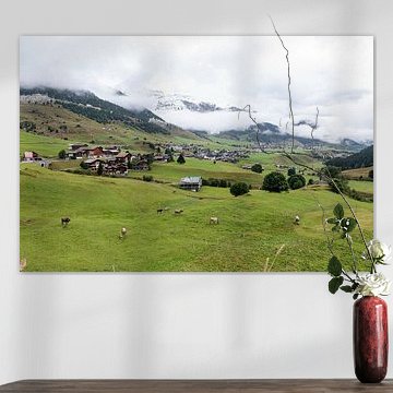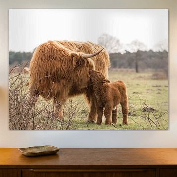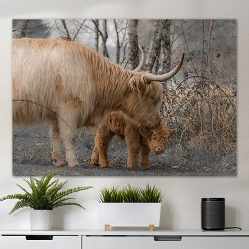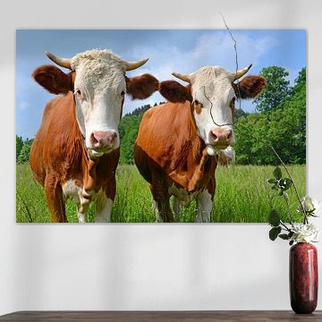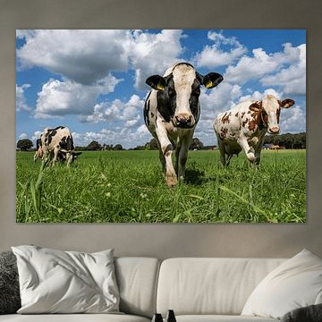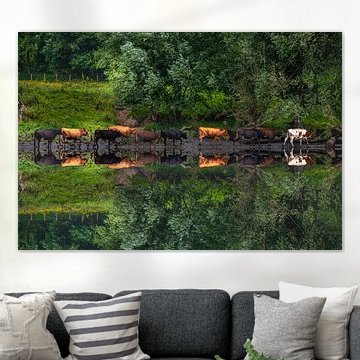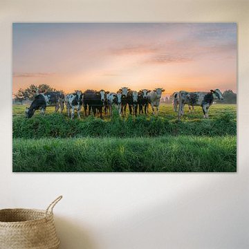 Looking for cosy cow paintings? Buy cheerful and colourful cow canvas prints here, or soothing photo prints of cows in the meadow. This beautiful rural wall art is versatile and can be combined with any interior and style. Country photography and cow paintings can be purchased from us on a customised basis and on high-quality materials. Think of impressive wallpaper with cows in the barn, or colourful cow paintings on acoustic panels to reduce the reverberation in your home.