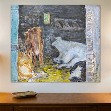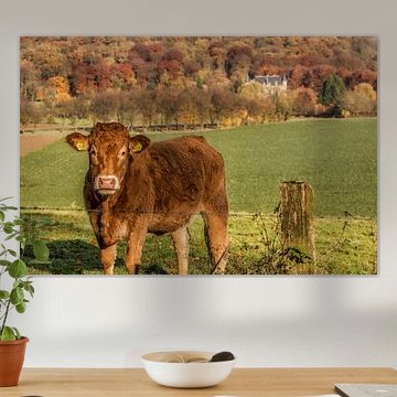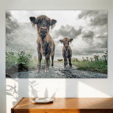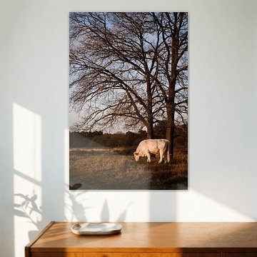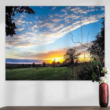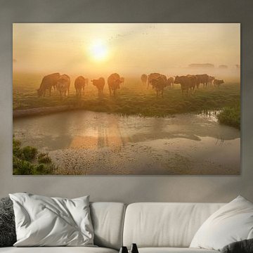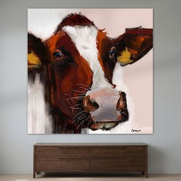 Looking for cosy cow paintings? Buy cheerful and colourful cow canvas prints here, or soothing photo prints of cows in the meadow. This beautiful rural wall art is versatile and can be combined with any interior and style. Country photography and cow paintings can be purchased from us on a customised basis and on high-quality materials. Think of impressive wallpaper with cows in the barn, or colourful cow paintings on acoustic panels to reduce the reverberation in your home.