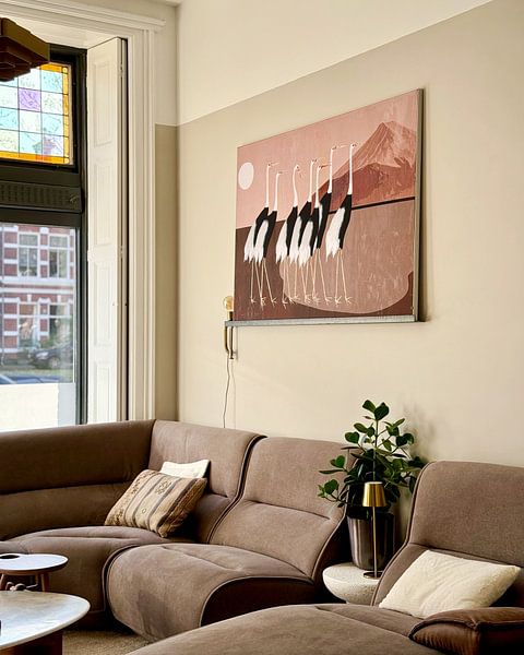 Cranes bring taupe, beige, and soft brown tones that fit naturally into Scandinavian and minimalist interiors. These earthy colours pair well with light wood furniture, linen textiles, and neutral walls, creating a calm and grounded atmosphere. If your cranes artwork includes blue or bronze accents, try combining it with warm brass lighting or cool-toned ceramics to enhance the natural palette. The result is an elegant, uncluttered space that feels both powerful and serene.
