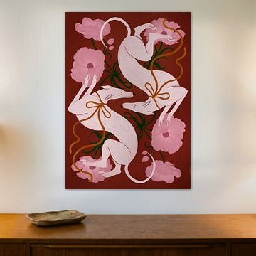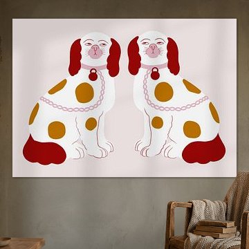 Brown, taupe and beige are the dominant colors in dog artworks. These warm earth tones pair naturally with wooden furniture, neutral textiles and plant accents. The terracotta and beige palette in Great Souls (2) works beautifully with natural materials like linen or rattan.