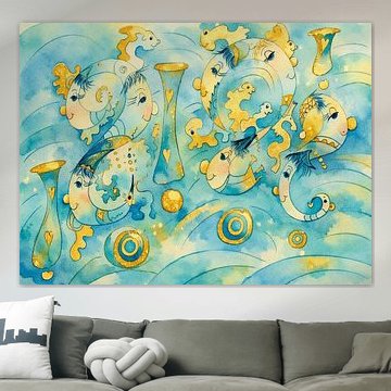 Fishing art captures both the beauty of marine life and the surreal possibilities of water worlds. From underwater schools of fish to whimsical, dreamlike compositions, these artworks bring calm and mystery into your space. The color palettes - deep teals, vibrant oranges, and soft mauves - work beautifully in contemporary and eclectic interiors, while pieces like Spinning swirl fish add dynamic movement to any wall.