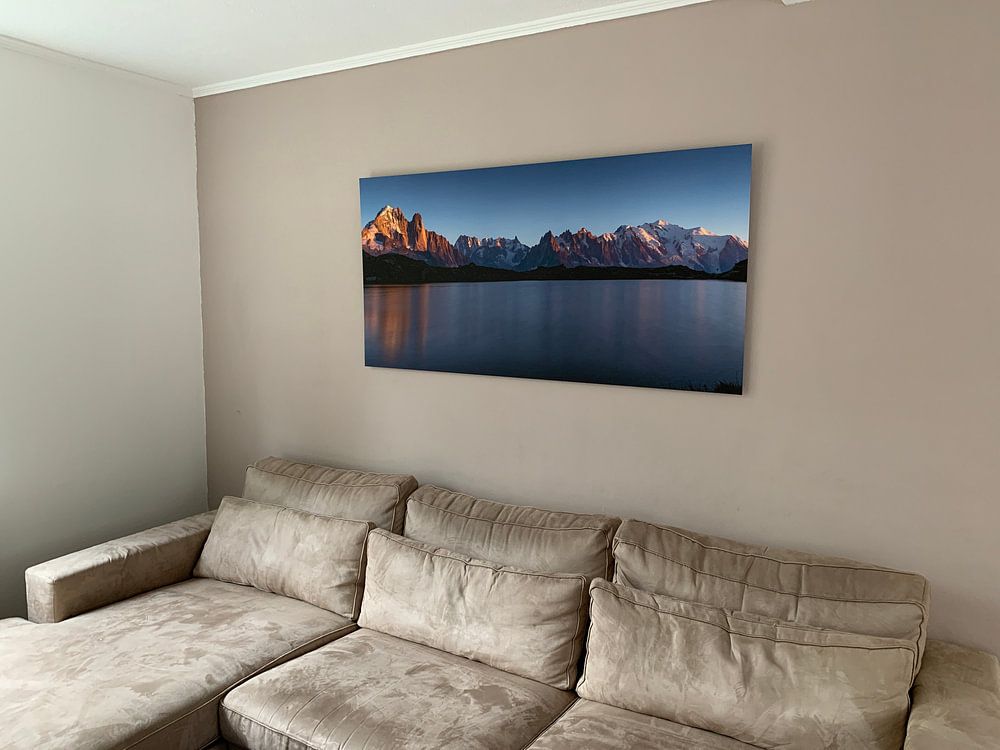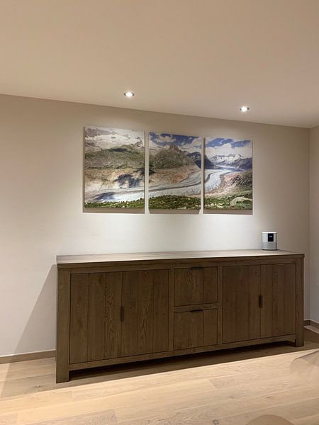 A living room is a good spot for Glaciers wall art, particularly above a sofa or sideboard where the artwork can become a natural focal point. The blue and teal tones bring a refreshing, cool atmosphere that balances warmer furniture and lighting. Choose Wallpaper for a full wall transformation, or select Canvas for a more traditional presentation. Portrait and landscape formats both work well depending on your wall dimensions and the mood you want to create in the space.