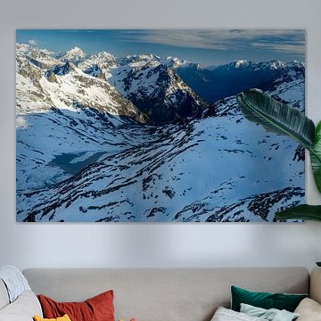 Glacier wall art brings raw natural power into your home. These artworks capture the quiet drama of ice formations, from deep crevasses to translucent blue caves. Teal and anthracite tones create calm yet mysterious atmospheres that suit modern and minimalist interiors beautifully, while images like Mountaineers on the Glacier de Moiry, Wallis, Switzerland show the scale of these frozen landscapes through tiny silhouetted figures against vast ice fields.