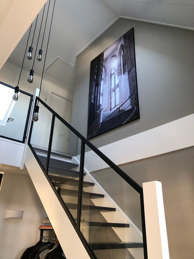 Dramatic upward perspectives draw the eye naturally toward higher spaces. Position these artworks in hallways or stairwells where vertical architecture can mirror the composition. The soaring vaulted arches in Walburgish church at night suit narrow walls where you want to create a sense of height and movement through your home.