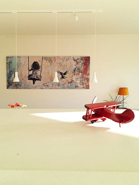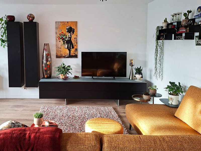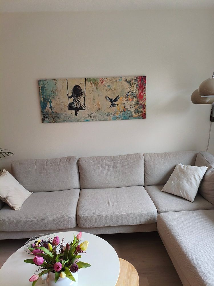 Street art - inspired pieces often feature bold graphics and raw energy. Balance that edge by pairing them with warm wood furniture or natural textures like linen and rattan. The brown and taupe tones in Girl on the Swing | Banksy Style | Graffiti work beautifully alongside oak or walnut finishes for a grounded, inviting look.