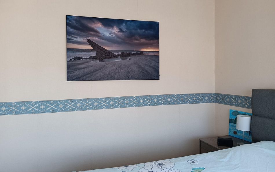 Gray-toned artworks suit rooms where you want to encourage relaxation and focus. The calming palette in Starling murmuration during sunset at the end of the day makes it a strong choice for living rooms or bedrooms, where softer colors help create a restful atmosphere. These tones also complement both cool and warm interior palettes without clashing.