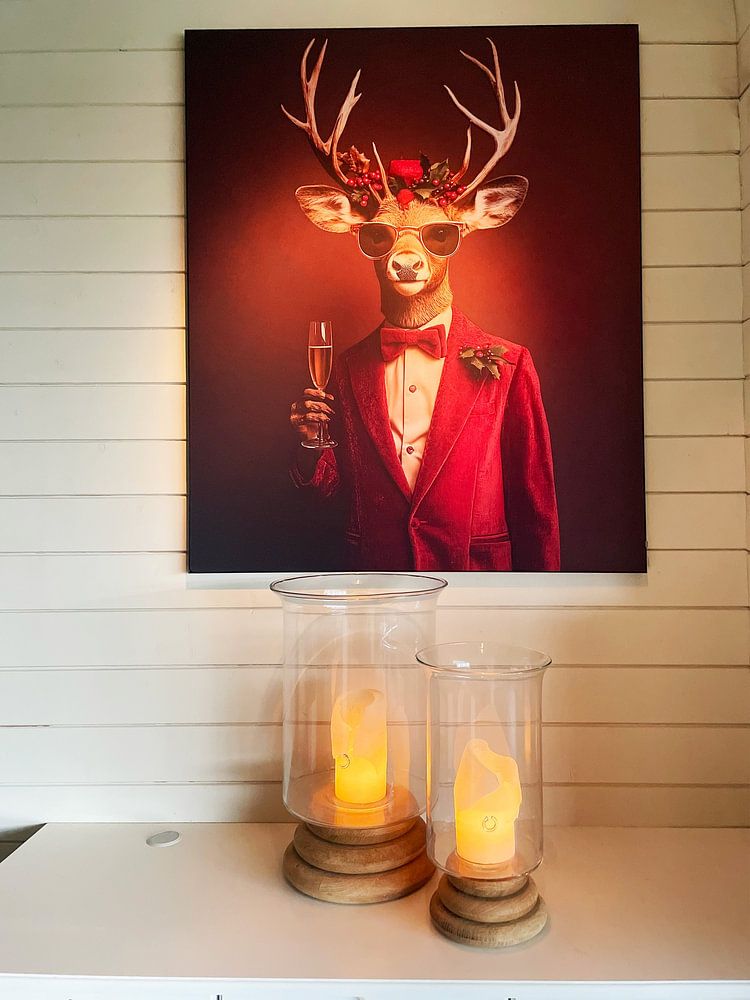 Artworks with a lighthearted twist suit rooms where you gather and entertain. The festive elegance in Christmas party brings a fun, conversational element to dining rooms or home bars. Pair it with warm lighting and rich fabrics to highlight the burgundy and brown tones in the piece.