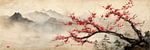 Cherry blossom in front of misty mountain peaks Japandi panorama by Digitale Schilderijen on canvas