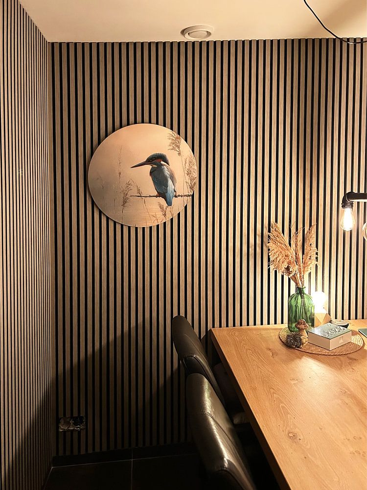 A living room is a good spot for kingfisher artwork. The calm yet vibrant mood of these designs creates a welcoming atmosphere above your sofa or sideboard. The natural color palette - from olive green to warm beige - connects indoor spaces with the outdoors, making your living room feel more spacious and grounded. Portrait and square formats work particularly well on feature walls, while landscape orientations suit the space above seating areas.