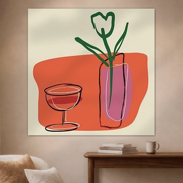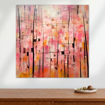 Abstract minimalist line art in bright pastel colors. Neon pink on red. by Dina Dankers