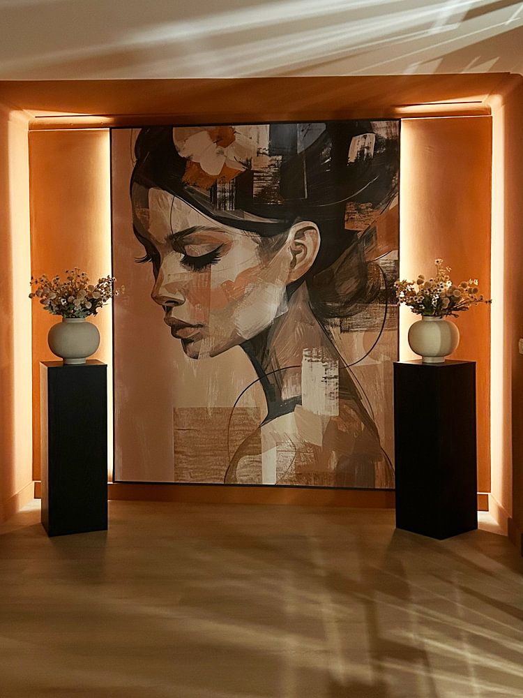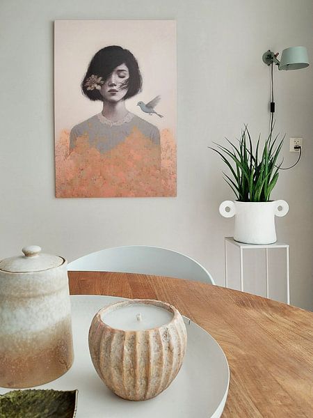 Contemplative artworks feel most at home in calm, personal rooms. Hang them at eye level - around 145 - 150 cm from the floor to the centre of the artwork - so you can appreciate the detail without strain. Female portrait | Woman suits a bedroom or reading corner where you'll pause and reflect.