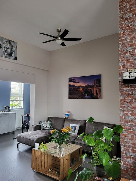 Historic structures work beautifully in spaces where you want to encourage calm reflection. Consider placing Ruin castle Nijenbeek in a reading nook or hallway where its mysterious, tranquil character can be appreciated up close. The earthy tones and weathered textures suit rooms with natural light and wooden furniture.