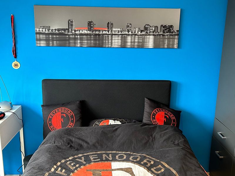Urban scenes photographed after dark create atmosphere in spaces with controlled lighting. Hang them where artificial light can echo the warm glow captured in the image. The illuminated buildings and reflections in Rotterdam skyline nighttime view at the Erasmusbrug over the New Maas work beautifully in living rooms or hallways with adjustable lighting, where you can match the ambiance of the scene.