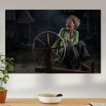 Old balinese woman with her spinning wheel in a small village near Ubud, Bali. by Anges van der Logt