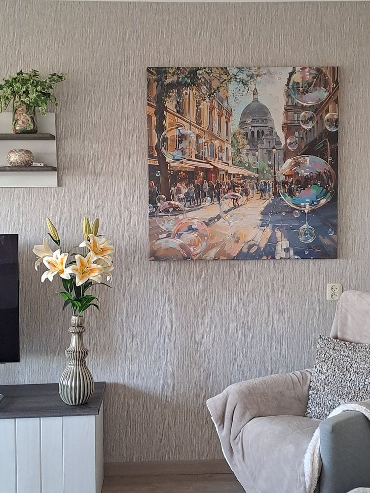 The Paris collection works beautifully in a living room, where its elegant and nostalgic character can set the tone for the entire space. These artworks pair well with neutral furniture and warm textiles, creating a sophisticated yet welcoming atmosphere. Consider hanging a landscape-format piece above your sofa or a square format above a sideboard to anchor the room. The calm mood of this collection makes it a good spot for creating visual balance without overwhelming your existing decor.