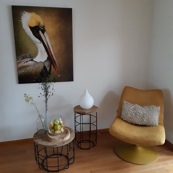Pale feathers stand out dramatically against darker backgrounds. If you have charcoal, navy, or deep grey walls, the bright plumage in Pelican against dark background will create a striking focal point that draws the eye and adds depth to your room.