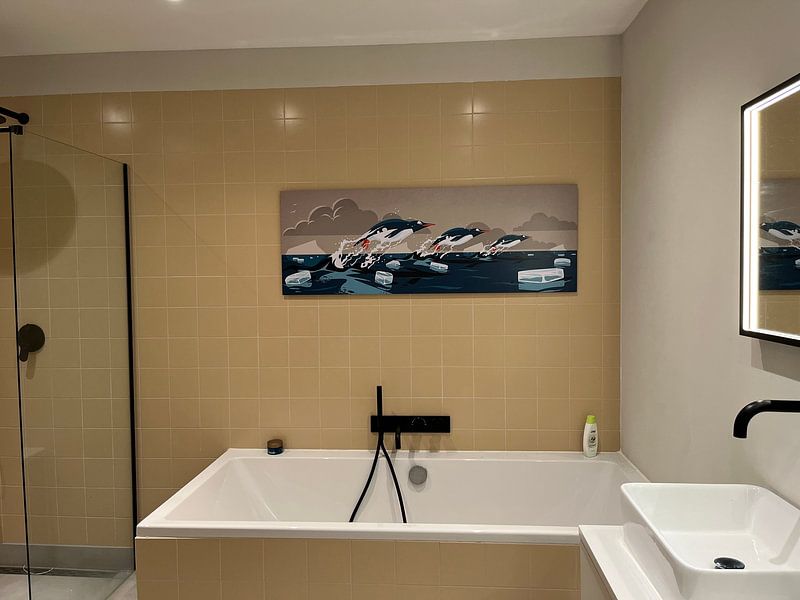 Penguin artwork brings a sense of calm to busy spaces. Place Bodyguard in rooms where you want to create a peaceful atmosphere - think bedrooms, reading corners, or home offices. The muted tones help balance interiors without overwhelming other design elements.