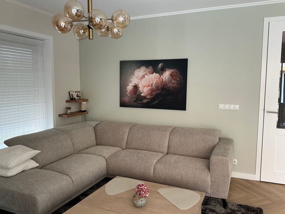 The gentle pink tones in Peony painting – romantic floral still life in soft light and pastel shades pair beautifully with teal or grey-green accessories. Try soft linen cushions, a ceramic vase, or a woven throw in these cooler shades. This combination keeps your space calm while adding depth and balance to the romantic floral palette.